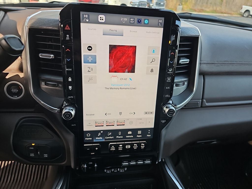 Cold Weather Group: Engine Block Heater; MOPAR Winter Front Grille Cover. Laramie Level 2 Plus Equipment Group: Google Android Auto; SiriusXM Radio Service; Power Adjustable Pedals with Memory; For Details Visit DriveUconnect.com; For More Info. Call 800-643-2112; Integrated Voice Command with Bluetooth®; Emergency Vehicle Alert System (EVAS); Power Deployable Running Boards; Auto Power-Folding Mirrors; Mirror Running Lights; Drowsy Driver Detection; MOPAR Deployable Bed Step; Alexa Built-In; Apple CarPlay; Power-Adjustable Convex Aux Mirrors; Active Lane Management System; Forward and Reverse Utility Lights; Disassociated Touchscreen Display; Remote Tailgate Release; 17 Speaker Harman/kardon Premium Sound; #1 Seat Foam Cushion; 2nd Row in Floor Storage Bins; Center Stop Lamp with Cargo View Camera; Rain Sensitive Windshield Wipers; LED Bed Lighting; Traffic Sign Recognition; Connectivity - US/Canada; GPS Navigation; 4G LTE Wi-Fi Hot Spot; Adaptive Steering System; GPS Antenna Input; Exterior Mirrors with Heating Element; Auto Dimming Exterior Mirrors; SiriusXM with 360L; Global Telematics Box Module; Connected Travel and Traffic Services; Foam Bottle Insert (door Trim Panel); Off-Road Information Pages; Selectable Tire Fill Alert; Trailer Tow Pages; Leather Trimmed Bucket Seats; HD Radio; 14.4" Touchscreen Display; Power Heat Fold Memory Telescopic Mirrors; Exterior Mirrors with Supplemental Signals; Exterior Mirrors Courtesy Lamps; Uconnect 5 Nav with 14.4" Display; MOPAR Spray in Bedliner; Auto High Beam Headlamp Control; Chrome Exterior Mirrors; Exterior Mirrors with Memory; Power Adjust Mirrors; Power Telescoping Mirrors; Auto Dimming Exterior Passenger Mirror; Auto Adjust in Reverse Exterior Mirrors. Quick Order Package 24H Laramie. Max Tow Package: Auto Level Rear Air Suspension; 5th Wheel/gooseneck Towing Prep Group; Auto Level Rear Air Suspension; Center Stop Lamp with Cargo View Camera; 5th Wheel/gooseneck Towing Prep Group. Towing Technology Group: Center Stop Lamp with Cargo View Camera; Surround View Camera System; Trailer Tire Pressure Monitoring System; Trailer Reverse Guidance. Chrome Bumper Package: Bright Rear Bumper; Bright Front Bumper. Dual Rear Wheels: Clearance Lamps; LT235/80R17E BSW All Season Tires; 17" Steel Spare Wheel; Box and Rear Fender Clearance Lamps; Center Hub; 6000# Front Axle with Hub Extension; 17" X 6.0" Polished Aluminum Wheels; 14. 000 Lb GVWR. Auto Level Rear Air Suspension. Power Deployable Running Boards. Leather Trimmed Bucket Seats. 5th Wheel/gooseneck Towing Prep Group. Center Stop Lamp with Cargo View Camera. 50 Gallon Fuel Tank. Instrument Panel Mounted Auxiliary Switches. MOPAR Front and Rear Rubber Floor Mats. Clearance Lamps. Transfer Case Skid Plate Shield. **Equipment listed is based on original vehicle build and subject to change. Please confirm the accuracy of the included equipment by calling the dealer prior to purchase.**